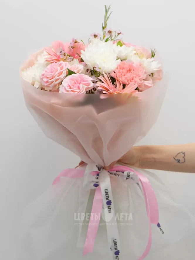 Букет «Дыхание весны»: нежное переплетение розовых гербер, роз, диантусов и белых хризантем, способное выразить чувства без слов.