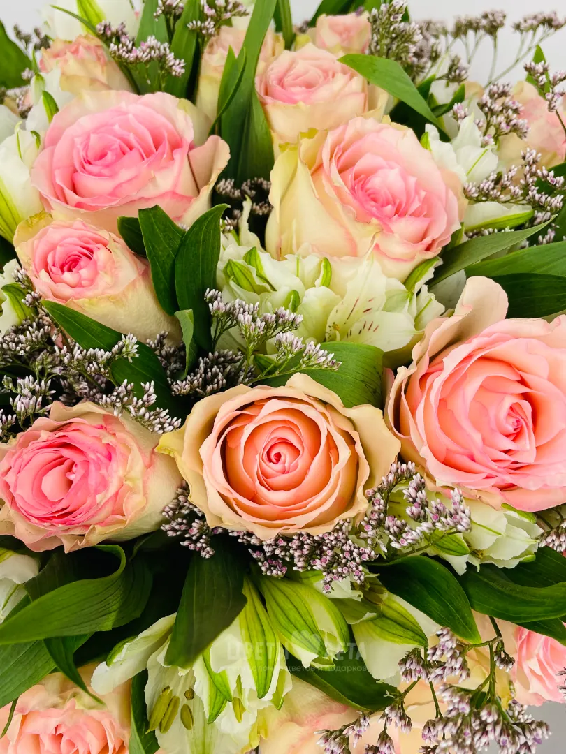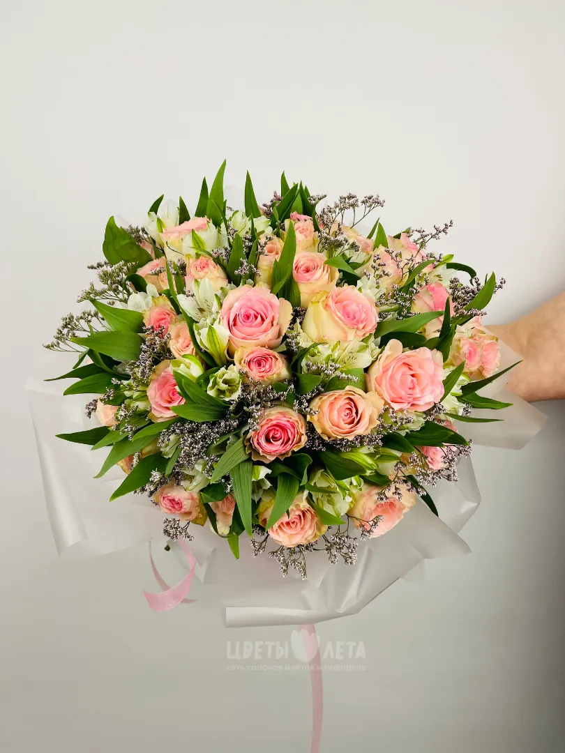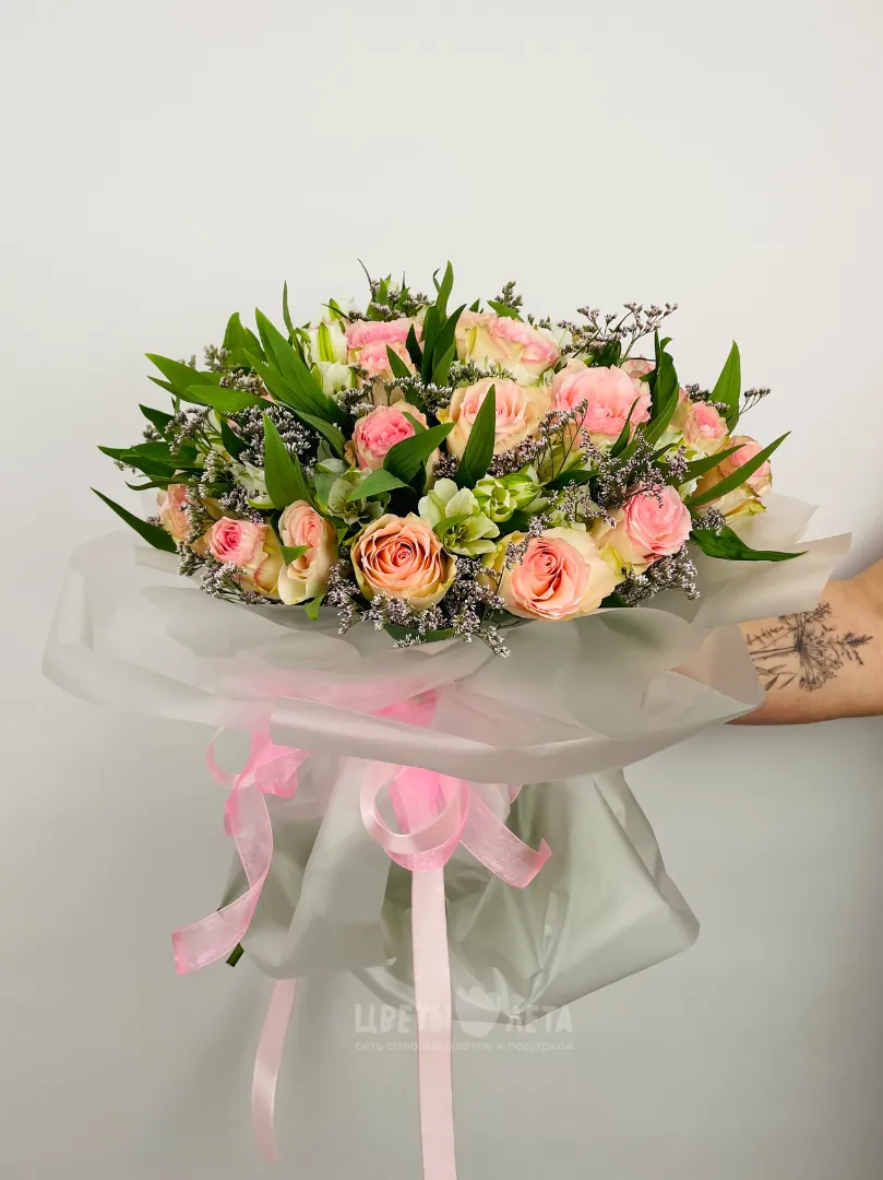 Состав может незначительно меняться, в зависимости от поставок и сезонности цветов, поэтому актуальное наличие уточняйте пожалуйста у менеджеров или в соцсетях.