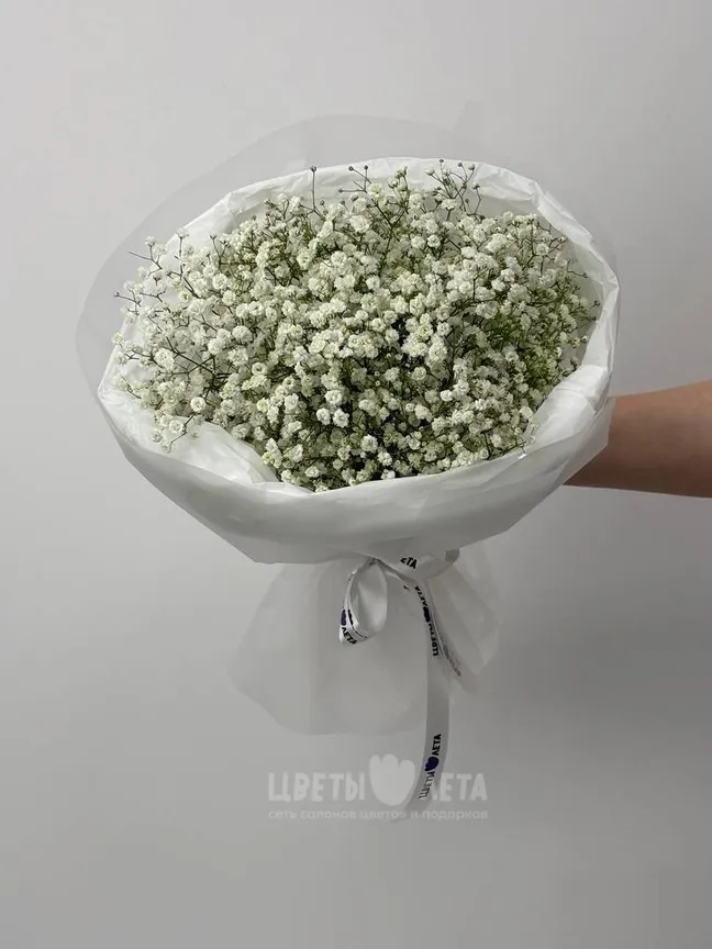 Этот воздушный букет состоит из белоснежной гипсофилы. Цветы отличаются нежным ароматом и высокой стойкостью. Букет перевязан атласной лентой и станет прекрасным подарком для тех, кто ценит красоту и изысканность.