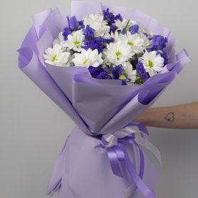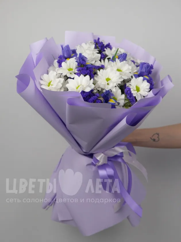 «Ощутите летний бриз с букетом »Полевая свежесть"! Белые ромашковые хризантемы, нежно-голубые ирисы и воздушная статица создают ощущение легкости, свободы и близости к природе. Этот букет – как глоток свежего воздуха в жаркий день.