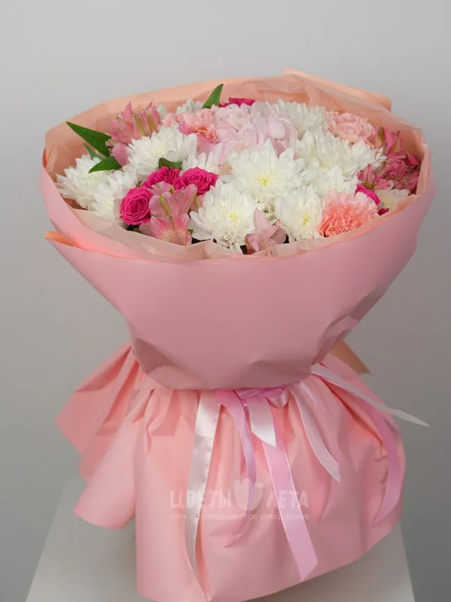 Насладитесь гармонией красок с букетом »Розовая симфония"! Этот букет, словно музыка, наполнен радостью, позитивом и нежностью. Розовые хризантемы, кустовые розы, гортензия и альстромерии создают неповторимую мелодию цвета и формы, которая подарит хорошее настроение на весь день.