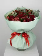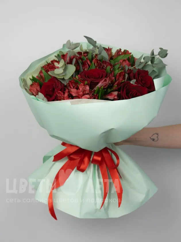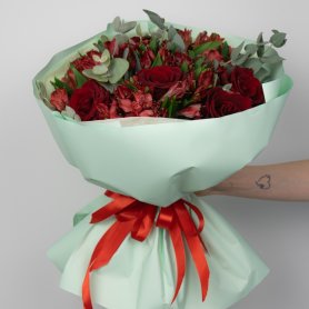 Покорите всех своим великолепием! Пышный букет из красных роз и альстромерий – это триумф красоты, страсти и роскоши.