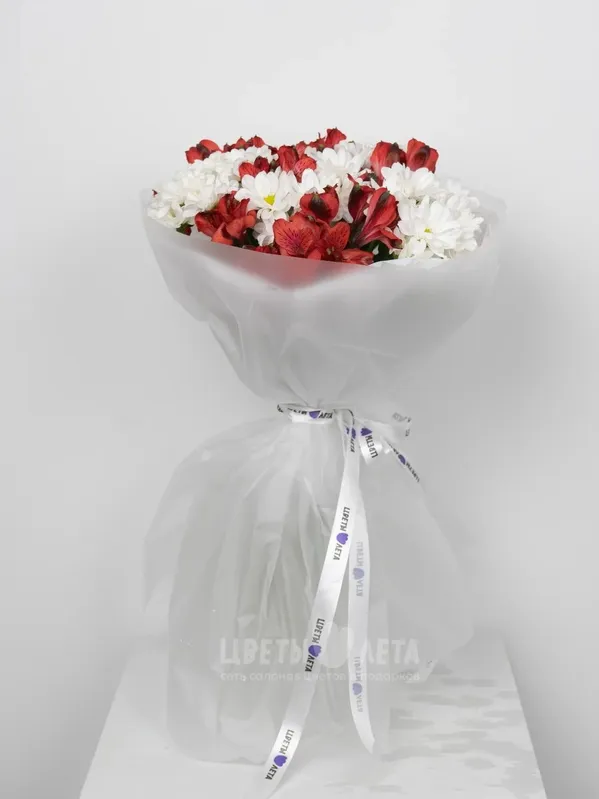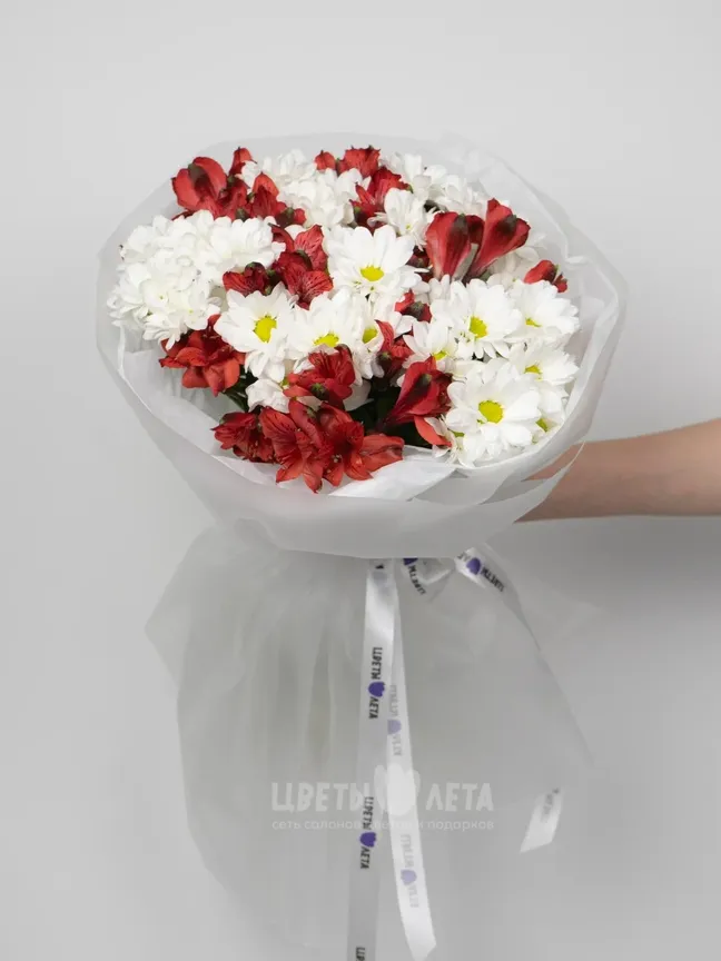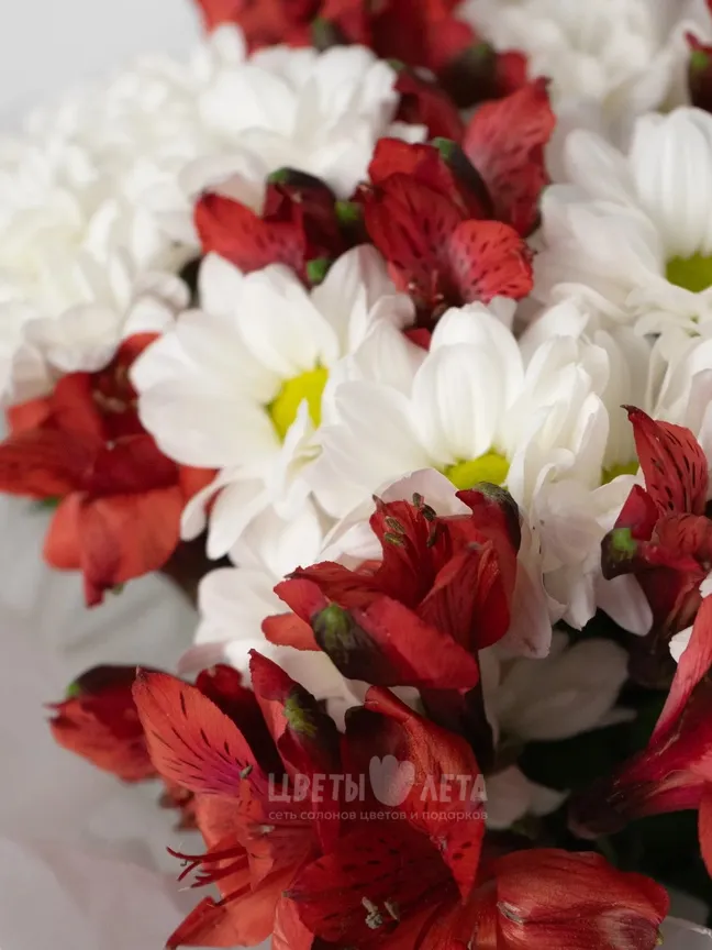 Подарите взрыв эмоций с этим ярким букетом! Ромашковые хризантемы, словно маленькие солнышки, в сочетании с алыми альстромериями создают атмосферу радости, тепла и оптимизма.
