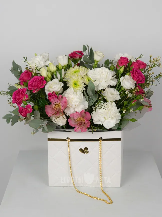 Состав композиции может незначительно меняться в зависимости от сезонности и наличия цветов. Пожалуйста, уточняйте состав и наличие у наших менеджеров или в социальных сетях.