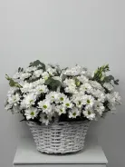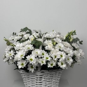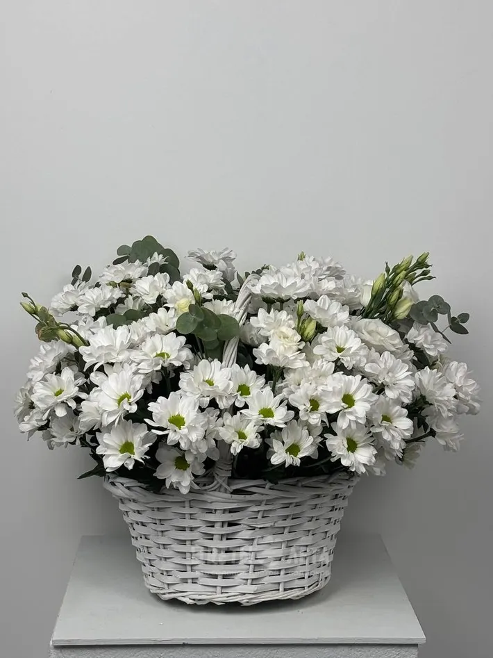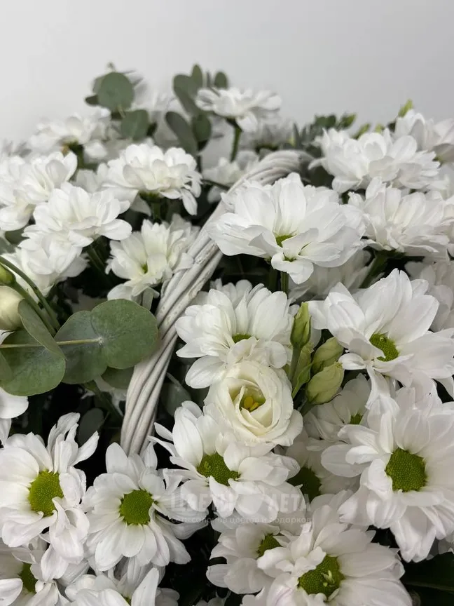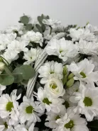 Ощутите прикосновение природы с композицией «Белый сад»! Белоснежные ромашковые хризантемы и эустома в сочетании с освежающим ароматом эвкалипта создают ощущение чистоты, свежести и легкости.