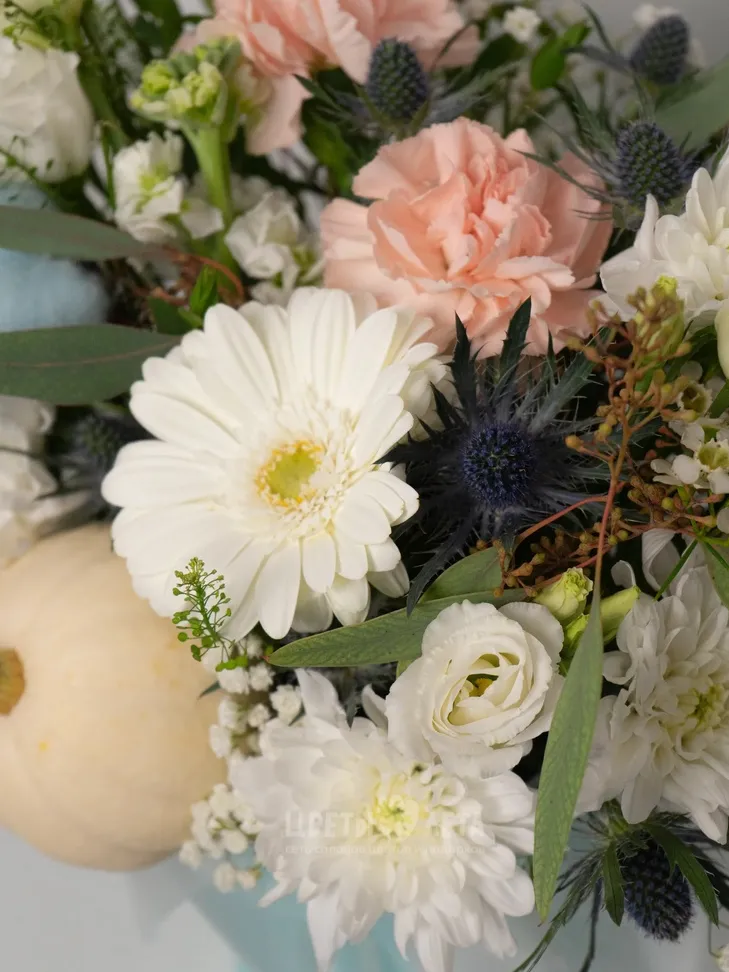 Композиция «Хрустальная нежность» – это изысканная гармония белоснежных и небесно-голубых оттенков, создающая атмосферу чистоты и волшебства.