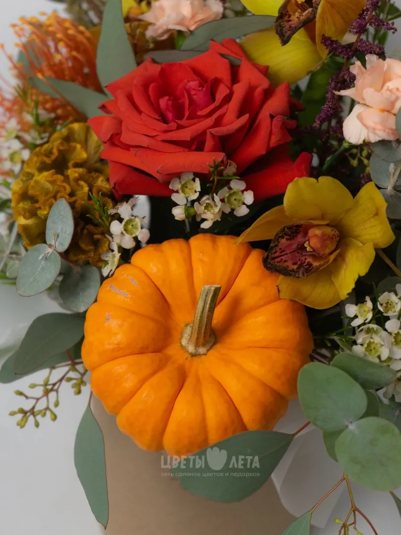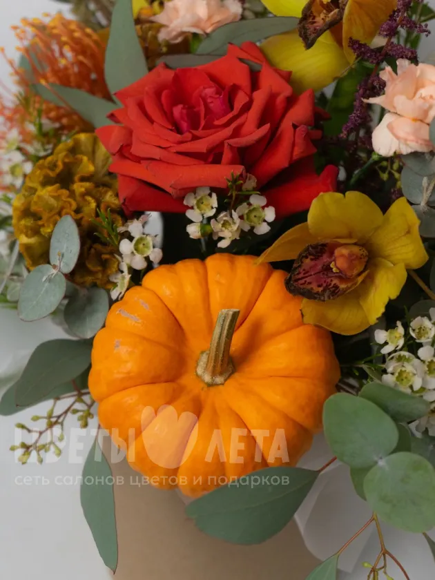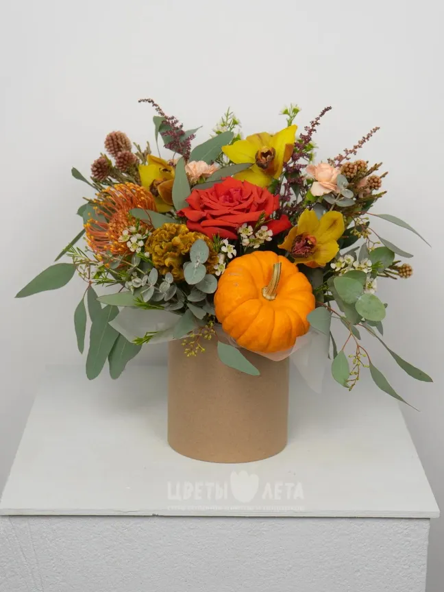 Насладитесь всей палитрой осенних красок с этой восхитительной композицией «Палитра осени»! Сочетание теплых оттенков красного, оранжевого, желтого и золотого создает атмосферу уюта, тепла и радости. Этот букет – словно запечатленный осенний пейзаж, он наполнит ваш дом светом и теплом.