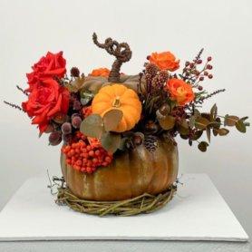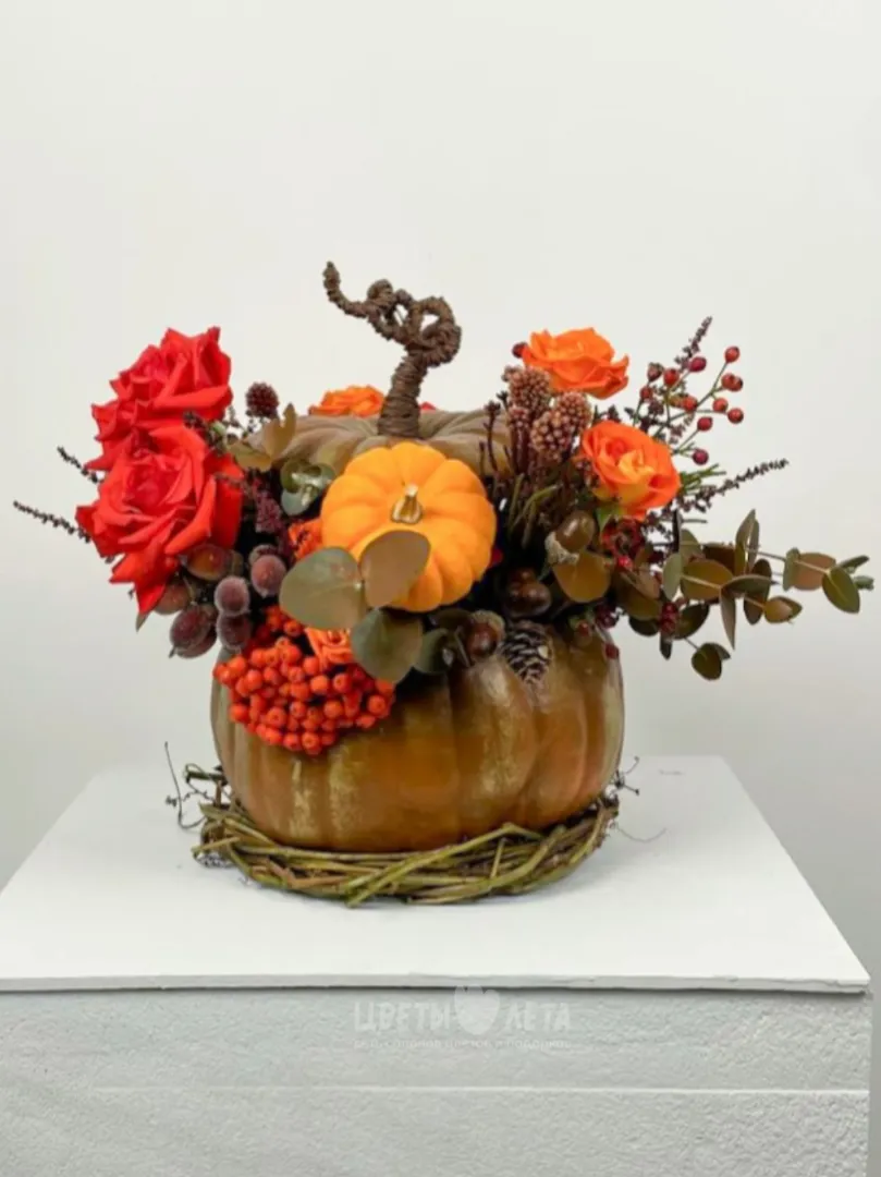 Композиция «Хэллоуинский сюрприз»: окунитесь в атмосферу таинственности и веселья с этой яркой осенней композицией!" Состав композиции может незначительно меняться в зависимости от сезонности и наличия цветов. Пожалуйста, уточняйте состав и наличие у наших менеджеров или в социальных сетях.