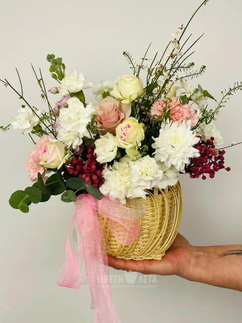 Состав может незначительно меняться, в зависимости от поставок и сезонности цветов, поэтому актуальное наличие уточняйте пожалуйста у менеджеров или в соцсетях.